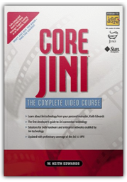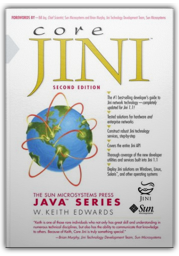 The rest of the text (over 800 pages) provides a practical tutorial that puts Jini to work, starting with a "Hello, World" example. Subsequent chapters cover essential areas of Jini functionality, like discovery, leasing, and the joinprotocol. Besides providing actual source code, the book does a good job of showing you how to compile and run each example program. (This information is particularly necessary with Jini, where, even for testing, programs run in separate pieces in a small distributed system.)Core Jiniteaches you the most common programming strategies for Jini (relying on higher-level APIs and built-in features), and also shows the lower-level APIs in separate sections for the more advanced reader who wants to know more.